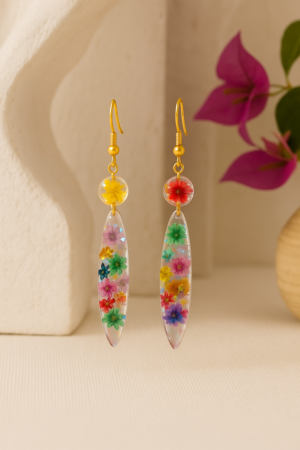 Chaque paire renferme de vraies petites fleurs séchées, figées dans la résine comme un instant de printemps éternel.