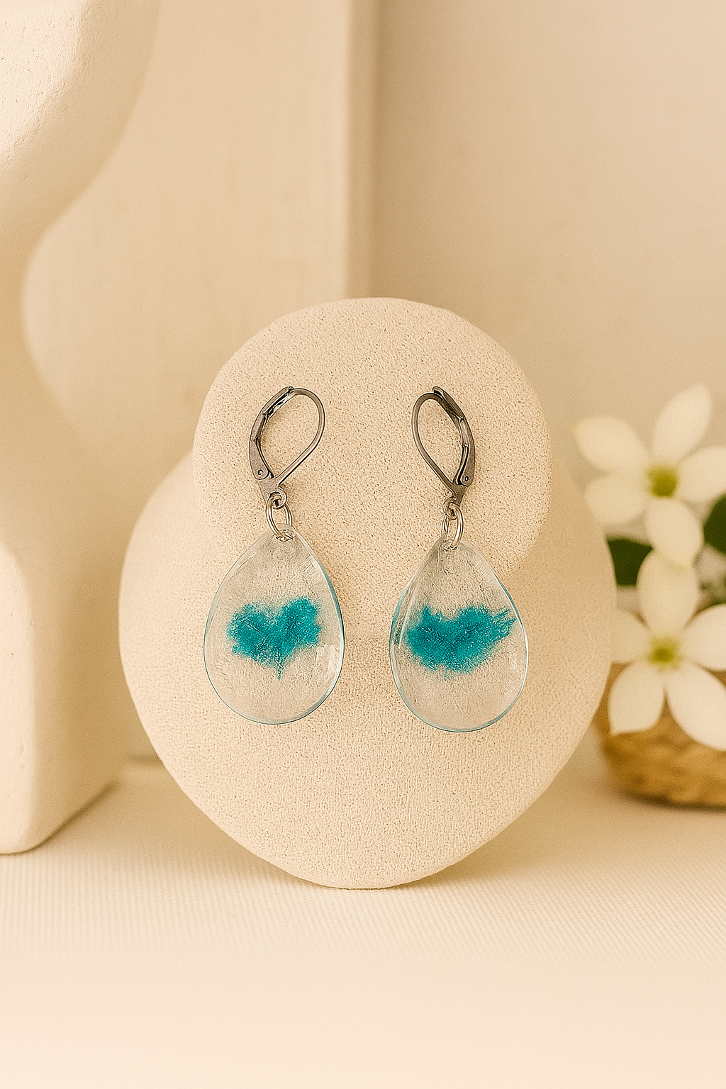 Légères et délicates, les boucles d’oreilles Lagune de Djerba capturent la beauté apaisante de la mer. Fabriquées à la main, chaque pièce renferme une touche de fleurs bleu suspendues dans une goutte de résine cristalline. 💛 Isola Bella – bijoux artisanaux, faits avec le cœur à Djerba.