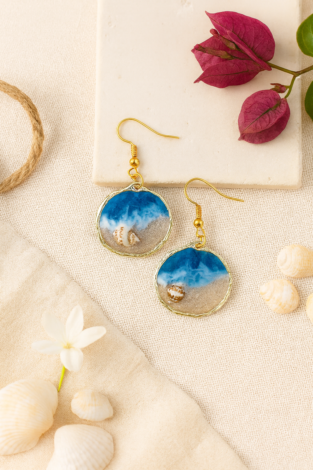 Je façonne ces boucles d’oreilles en résine, où se mêlent sable et coquillages de mon île.