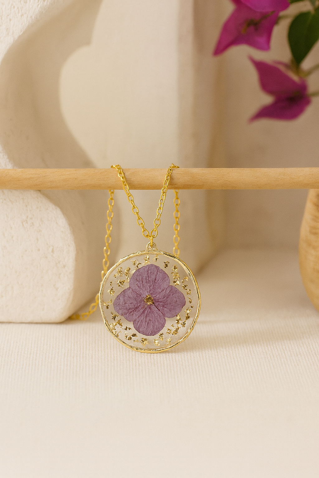 Ce collier met à l’honneur une fleur d’hortensia, figée dans la résine et entourée de pépites dorées, comme un écrin de lumière.