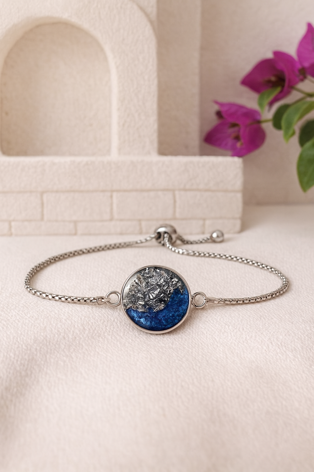 Élégant et lumineux, ce bracelet s’inspire des nuits profondes de Djerba. Son médaillon rond associe un bleu intense à de délicats éclats argentés, créant un contraste raffiné et moderne. Réalisé à la main, chaque pièce est unique et révèle un jeu de textures et de lumière.