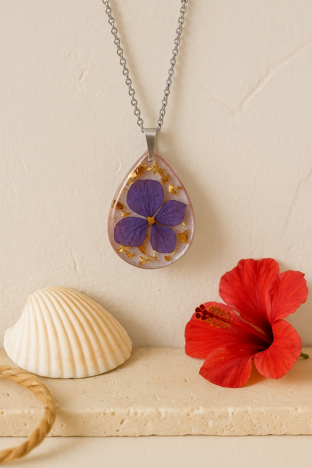 Ce collier met en lumière une fleur d’hortensia, figée dans la résine et entourée de fines touches dorées, comme un écrin de poésie.