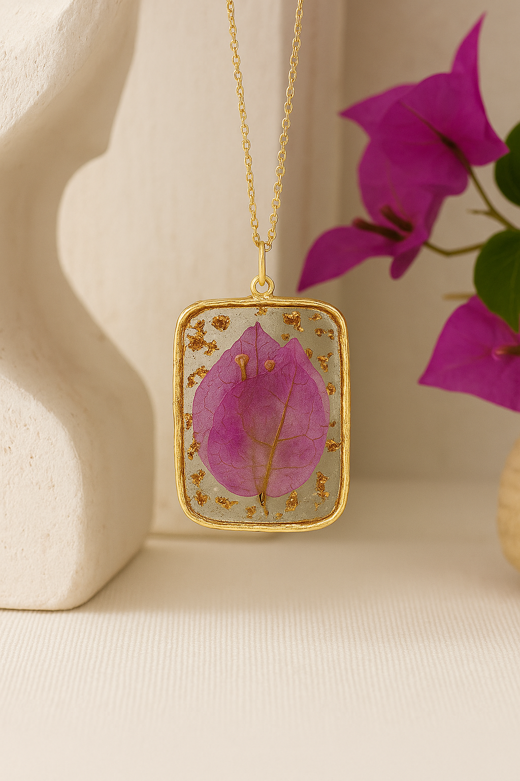 Un collier façonné à la main, qui préserve la beauté éphémère d’une fleur méditerranéenne, à porter près du cœur 🌊💜 💛 Isola Bella – bijoux artisanaux, faits avec le cœur à Djerba.