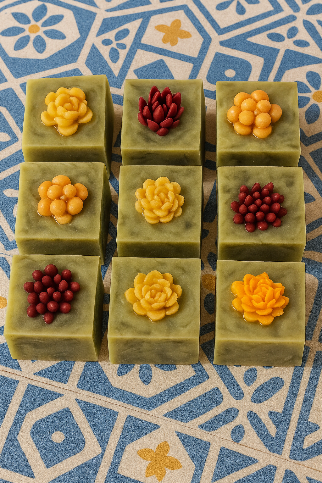 Plongez dans la douceur d’un savon fait à la main, inspiré des jardins ensoleillés de Djerba. Chaque carré est orné d’une petite fleur sculptée, symbole de délicatesse et de soin.